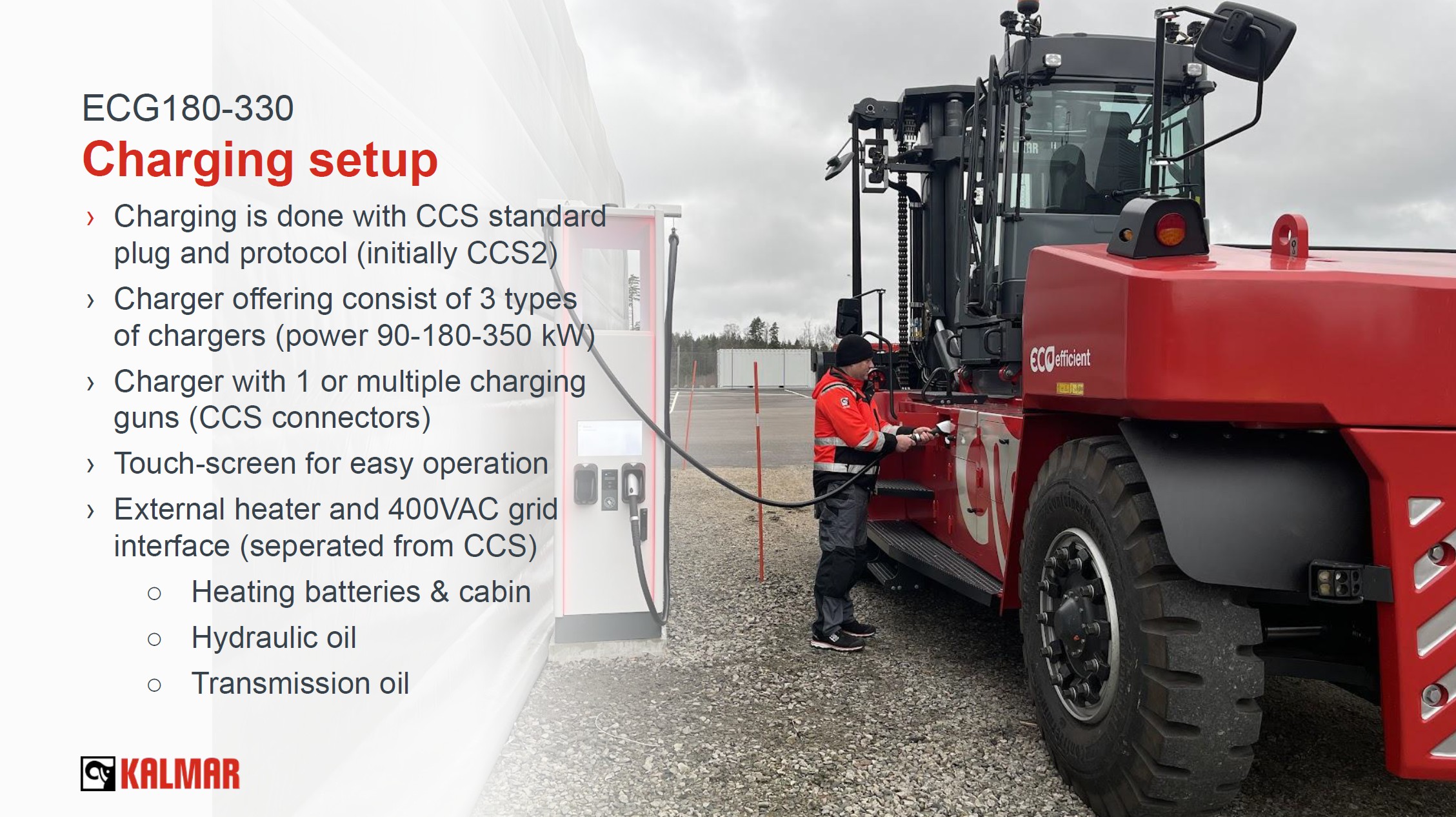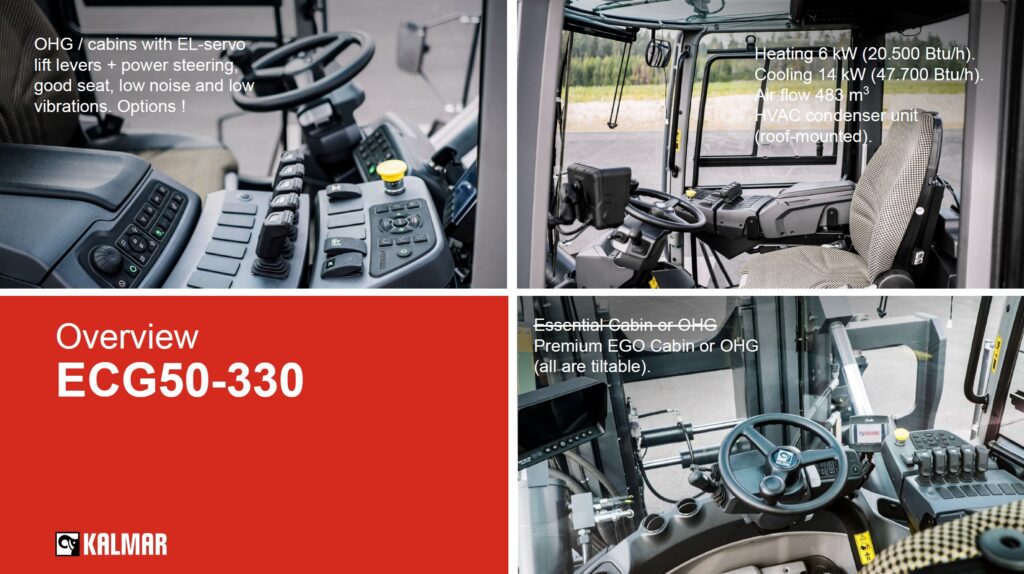 Kalmar ECG180–330 je stavěn pro nejnáročnější průmyslové aplikace. Silný rám, olejem chlazené kotoučové brzdy a dimenzované hydraulické komponenty garantují dlouhou životnost. Vozík je testován v hutích, přístavech, dřevozpracujících provozech i logistických centrech.