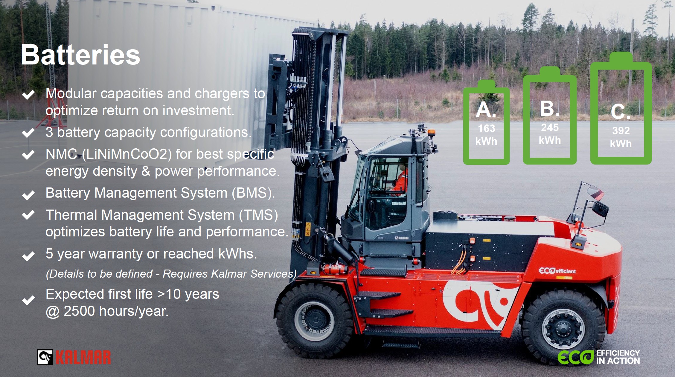 Na výběr jsou tři kapacity Li-ion baterií (163 / 245 / 392 kWh), které lze kombinovat s různými nabíjecími řešeními až do 350 kW. Díky možnosti průběžného dobíjení během přestávek zůstává vozík v provozu i při náročném vícesměnném nasazení. Baterie jsou bezúdržbové, mají životnost až 10–12 let a jsou chráněny inteligentním systémem správy (BMS).