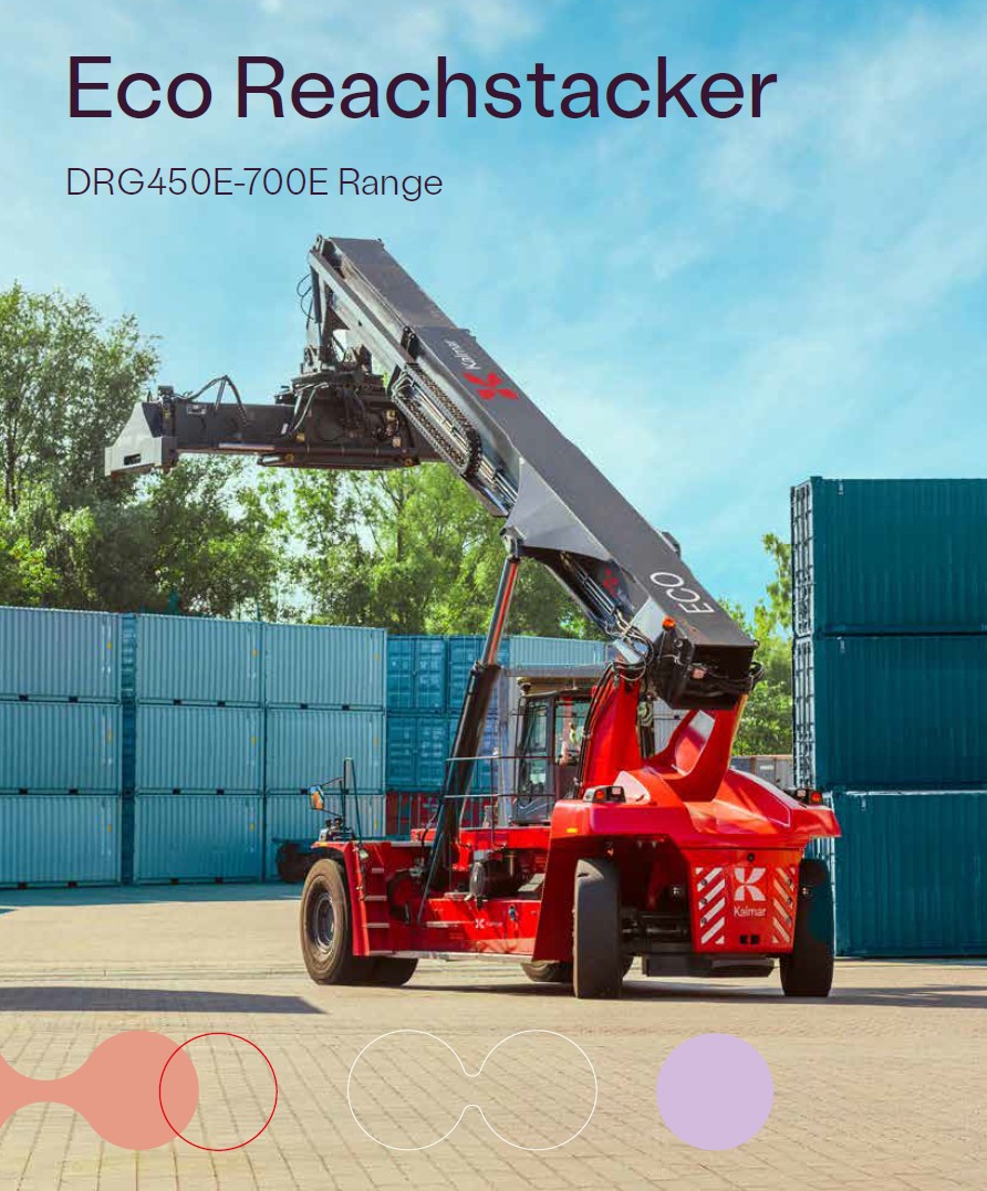 Kalmar DRG450E–700E = reachstacker řady Eco určený pro manipulaci s kontejnery o hmotnosti až 45 tun - 70 tun. Úspora paliva až 40 %, HVO100 – až 90 % méně CO₂, Eco Drive Modes, EGO kabina, digitální Kalmar Insight a nejnižší TCO ve své třídě. Udržitelné a spolehlivé řešení pro terminály, přístavy a těžký průmysl.