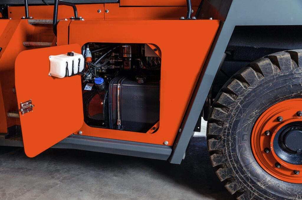 Přístup k motoru a převodovce ihned za servisními dveřmi. Hydraulika a elektrika přehledně oddělené. Automatické centrální mazání, minimální prostoje.